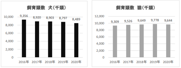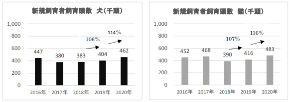 一方、1年以内新規飼育者の飼育頭数は、犬・猫共に2018年を底に、2019年、2020年と増加傾向にあり、2020年の増加率は2019年よりも更に高まっていると発表がありました。新型コロナウィルス禍の影響で、ペットとの生活から癒しを求めたり、家族内でのコミュニケーションを深めている傾向がうかがえます。